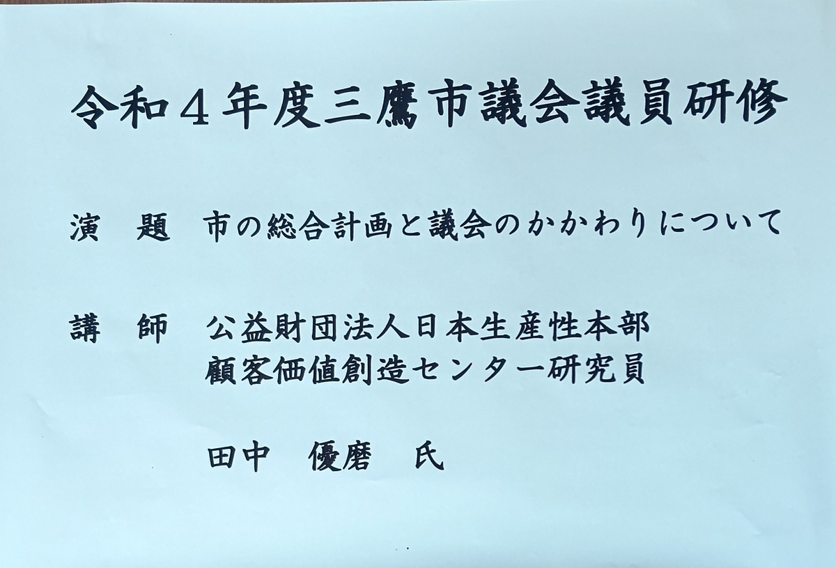本日、令和4年度三鷹市議会議員研修が市議会全員協議会室のにおいて、公益財団法人 日本生産性本部 顧客価値創造センター研究員の田中優磨講師をお招きして開催されました。